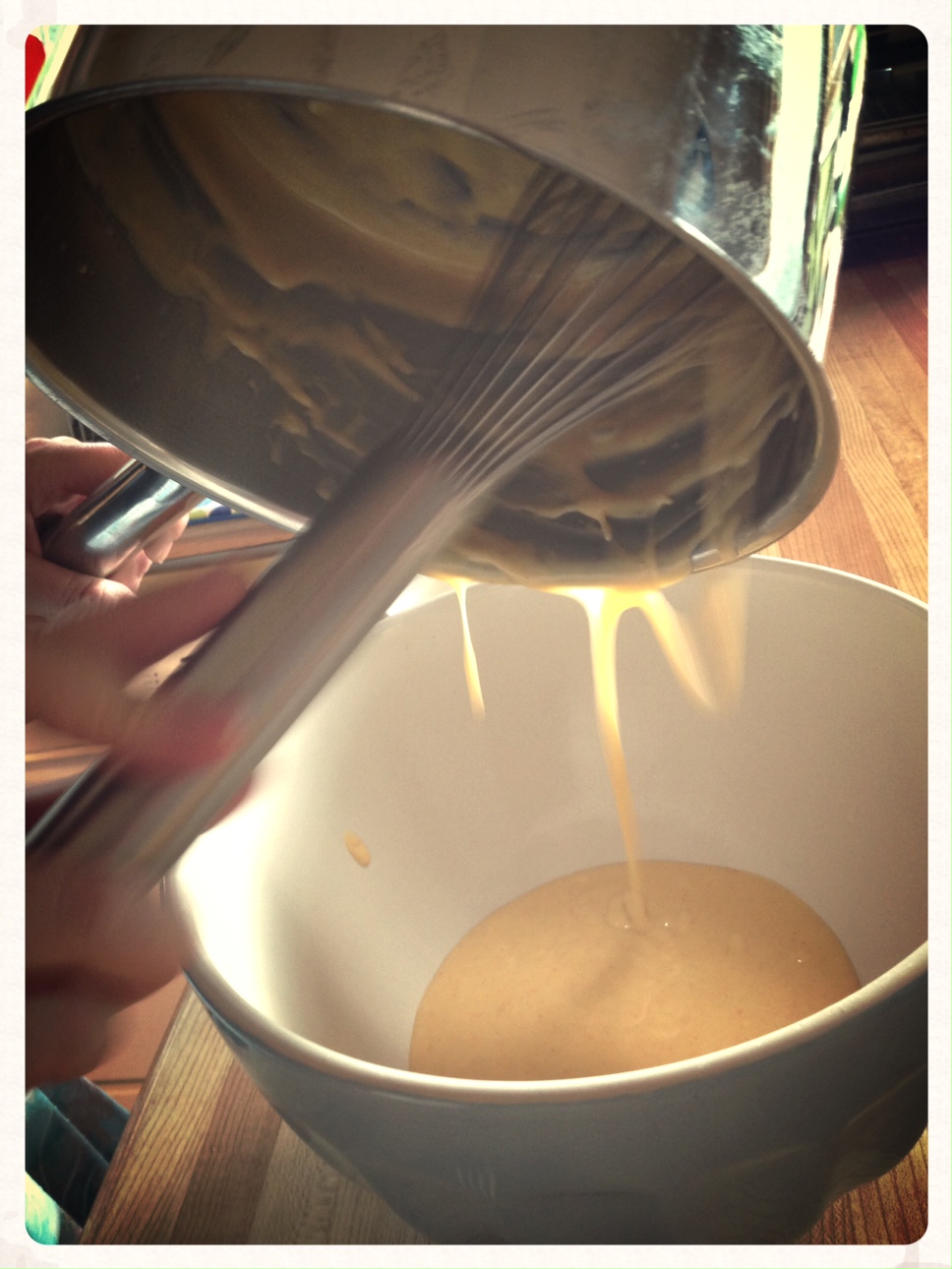 Scrape the egg-yolk concoction, with butter, flour, milk and seasonings, into a bowl and cool to lukewarm.